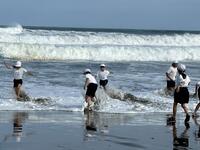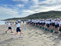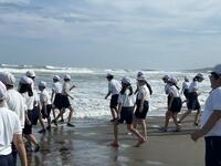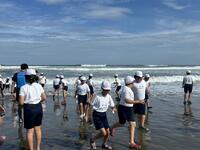広い食堂でお昼を食べてから、いよいよ海辺での活動です。砂浜に着くと、打ち寄せる波に歓声が上がりました.