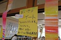 たくさんの児童が図書袋を手にやってきました。床に貼られたテープに沿って、並んで