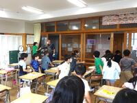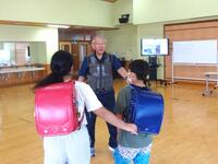 避難行動の訓練の後、熱中症対策のため教室に戻り、オンラインでスクールサポーターさんから「いかのおすし」のお話を聴きました。6年生の代表と登下校中に不審者に出会ったときの対処法について、実演付きで説明を聴きました。