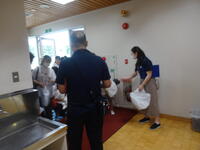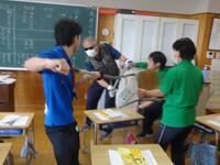 はじめに、教室に不審者が侵入した場合の対応を訓練しました。2年生の教室に突然不審者が入ってきました。もちろん子どもたちには事前に説明をしていたので、担任の指示ですぐに逃げました。声を聴きつけて、隣の学級の先生がかけつけました。校内放送を聴いてさらに多くの先生方が加勢し、不審者に対応しました。スクールサポーターさんから、さすまたの上手な使い方などを指導していただきました。