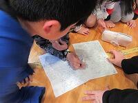 続いて、班長、集合時刻、集合場所を決め 、歩いてくる通学路を登校班カード裏面に赤色の線で記入しました。児童には7:50