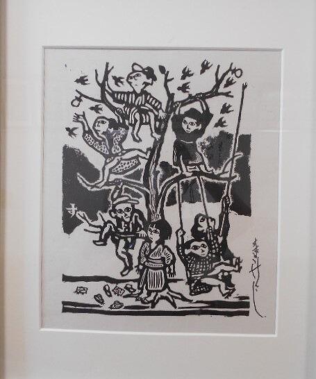 子どもたちが木に登って遊ぶ姿が、生き生きと表現されています。画面の中から、今にも子どもたちの声が聞こえてくるようです。