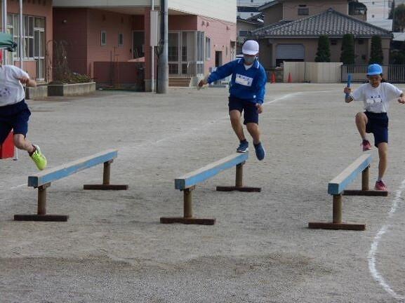 平均台、ネット、ピンポン玉運びの3つの障害をクリアして、次の選手にバトンをつなぎます。