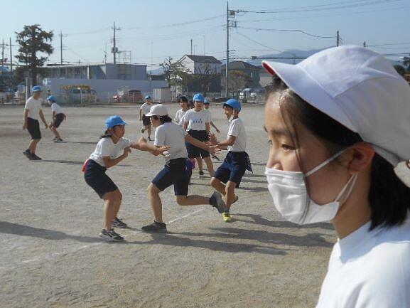 腰につけたバンダナを、できるだけたくさん奪うチーム戦。バンダナを取られまいとクルリと身をかわしながら、全力で疾走する6年生の姿が、トラック中に広がりました。