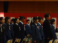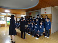 中学校の制服姿は、昨日よりも成長を感じました。式の前には、学級ごとに記念撮影を行い、日惜ホールで最後に歌の練習もして気持ちを高めました。