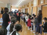 準備が整ったところで、お見送りです。校舎4階から、児童が並んで拍手でお見送りする中を、先生方に歩いていただきました。PTA会長さんをはじめ本部役員のみなさんも、お見送りしてくださいました。