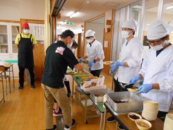 配膳の様子。給食当番の数も、これまでより少なくなります。当番の人は手袋をしています。