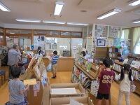 今日は、夏休み後半の『図書室開館日』で、たくさんの児童が本を借りに来ていました。毎回日替わりで登場する「妖怪