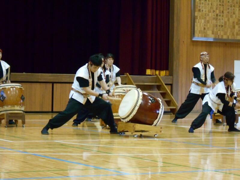 演奏が始まると、体育館の空気が一瞬で変わる迫力ある和太鼓の力強い音色。耳だけでなく、お腹にも沁み渡る和太鼓の響き。