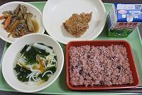 献立』で「お赤飯・ごま塩・牛乳・鶏の唐揚げ・五目きんぴら・豆腐の澄まし汁・いちごのゼリー」のメニュー