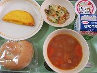 』で、「コッペパン・牛乳・野菜とひき肉のキーマカレー・コーンスープ・いちごジュレのフルーツポンチ」の献立でした。コーンスープに「ハート型にんじん」が入っていた人は大当たり
