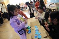 先に、1年生が作った「秋のおもちゃ」で、2年生を招いて遊んでもらいました。1年生は、グループごとに説明や体験の準備をしました。コーナーのプラカードを作って、2年生を集める工夫もしました。
