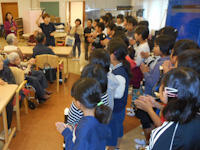 続いて、新聞紙ゲーム。岡野先生とじゃんけんをして、負けたら、新聞紙を小さくたたみます。親子で新聞紙から落ちずに乗れるかな・・・