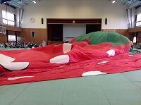 後半は、体育館に本物の熱気球をふくらませ、熱気球の中に入れていただく体験をしました。広い体育館がこんなことに…