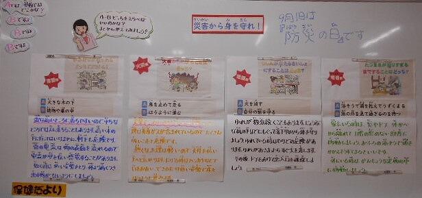 9月1日は防災の日です。1923年(大正12年)の9月1日に発生した関東大震災にちなんで、1960年(昭和35年)に制定されました。学校でも、保健室前のホワイトボードに、災害から身を守るための留意点などが掲示されました。