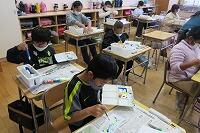 できた人から、廊下のテーブルに並べて乾かしましょう。「上手だね。」「すてきな色だね。」「ぼくも、もう一枚がんばろう。」賞賛と励ましの声掛けができる4年生です。