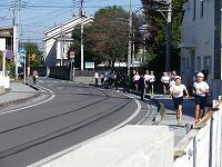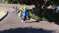 校庭西側から、東門めがけて力強い走りです。3・4年生は外周りを2周、1120mです。