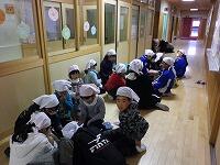 メニューは、ごはん・野菜と豚肉の炒め物・春菊のごまあえ・豆腐入りたまごスープ・牛乳です。くせのある春菊が最大の難所。みんな、食べられたかな~と思いながら廊下を見て回っていると・・・