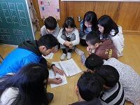 各クラスに6名ずつ入ってくれた中学生、自己紹介のあとにはグループごとに分かれて学習のことや部活動のことなど、中学校生活について教えていただきました。