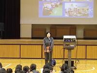 給食の始まりを映像で説明したあと、調理員さんお一人ずつ紹介して楽しいインタビューもありました。調理員さん方に「感謝の言葉」をお伝えし、工夫して作ったプレゼントを差し上げ、調理員さんを代表して野尻さんのお話を聞きました。
