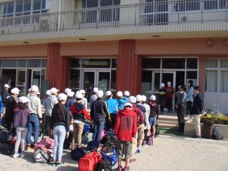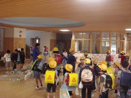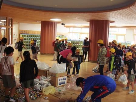 昇降口は、”ガチャンガチャン”と缶をつぶす音でにぎやかです。