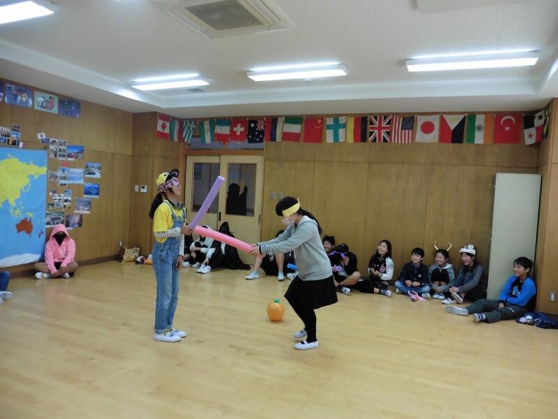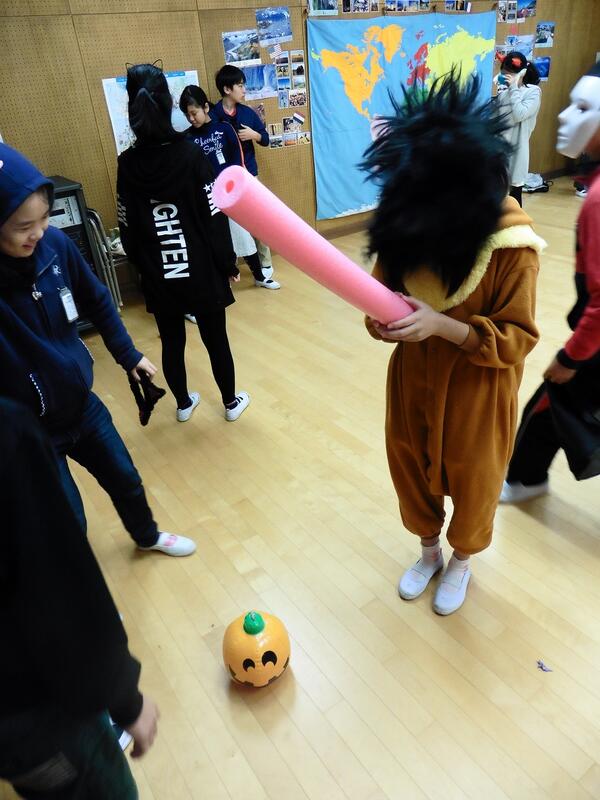 単語や文化について学習した後は、スイカ割りならぬ、カボチャ割り!