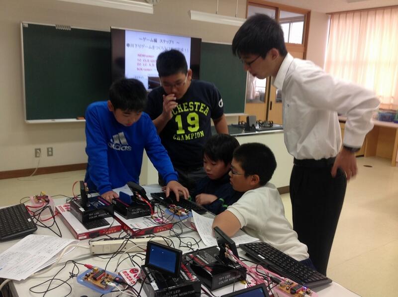 子どもたちも教室にならぶ機械に興味津々です。栃木工業高校の高校生が開発したスカイベリージャムを使ってプログラミングについて学びました。