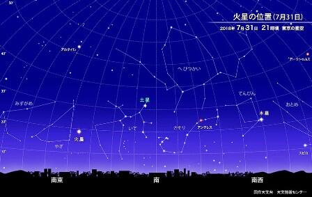 国立天文台ホームページによると、明日7月31日に火星が地球に最接近するということです。最接近時の火星と地球の間の距離は5,759万kmで、6000万kmよりも近い距離まで近づくのは2003年の最接近以来15年ぶりだそうです。