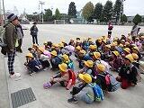 出発式。グループでなかよく楽しく校外学習を行うために、校長先生と岡野先生のお話をよく聞いています。