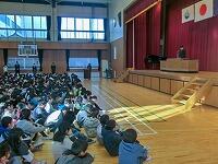 正対して、作文の朗読や校長先生の話を聞くこと。