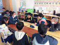 いつもの学校、いつもの教室なのになんだか不思議な感じです。アイマスクをしただけで、こんなにも不自由なのかと感じることができました。