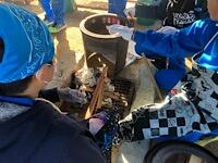 焼きいも班は、いもを針金に取り付けています。