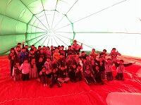 後半は、体育館に本物の熱気球をふくらませ、熱気球の中に入れていただく体験をしました。広い体育館がこんなことに…
