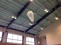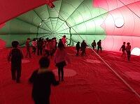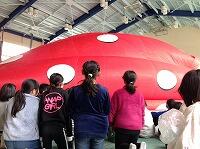 後半は、体育館に本物の熱気球をふくらませ、熱気球の中に入れていただく体験をしました。広い体育館がこんなことに…