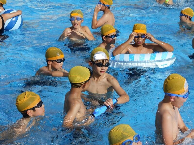 思い思いの遊具を持参し、普段学校では絶対にできないような遊びに没頭。プールサイドで見守る先生方もびしょぬれです。