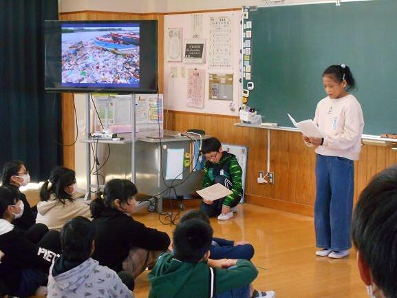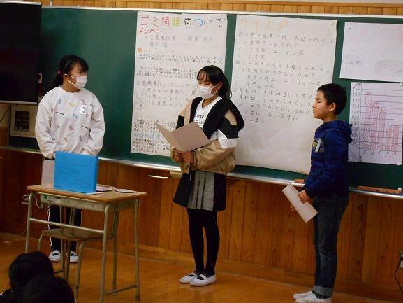 各クラスごとの内容は、総合「環境・今、環境から学ぶ」で、自ら課題を設定して調べたことを発表しました。「環境汚染」や「ごみ問題」「地球温暖化」など、様々な切り口から自分たちとの関わりを見つめ、課題解決のための提案を発表しました。
