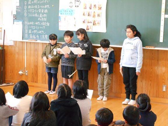オープニングで見事なパフォーマンスを披露した後は、各クラスごとに総合で調べた「栃木市」についての発表です。「蔵の街」や「巴波川」「秋まつり」などについて、それぞれのグループで協力し合って発表しました。クイズ形式やインタビューなど、それぞれ趣向を凝らした発表でした。