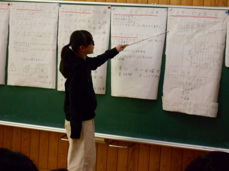 4年生は、総合で福祉について調べました。「手話」や「点字」、「車いす」や「盲導犬」「バリアフリー」などについて、グループで調べたことをまとめ、紹介することができました。これらについて調べることで、障がいをもつ方や高齢者の方と、自分たちがどう関わっていけばよいかも発表できました。