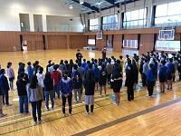 オープンスペースで、いつもと向きを変えて並ぶ6年生。