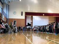 オープンスペースで、いつもと向きを変えて並ぶ6年生。