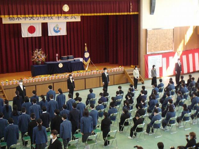 練習時間がほとんどないまま、教室で担任から心構えを聞き、式の前に1度だけ流れを説明され、1度だけの練習で本番を迎えました。校歌も歌えず、別れの言葉もなく、証書授与と校長からの式辞のみの式でした。子どもたちは緊張の面持ちでしたが、本当に心のこもったいい式が挙行されました。