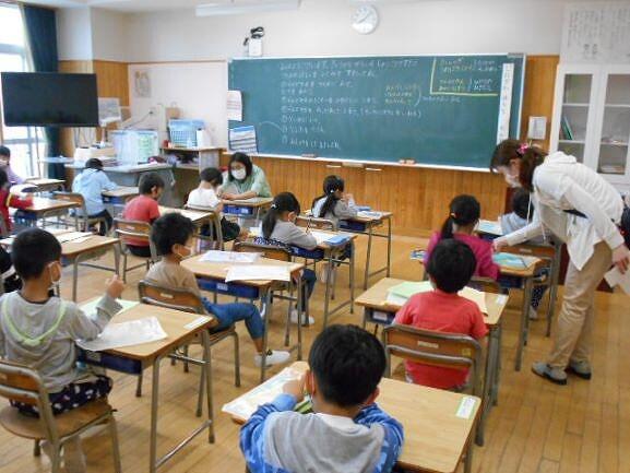 5年生の外国語の授業の様子です。アルファベットの学習をしていました。担任やALTの話をよく聞き、ゲームに参加します。