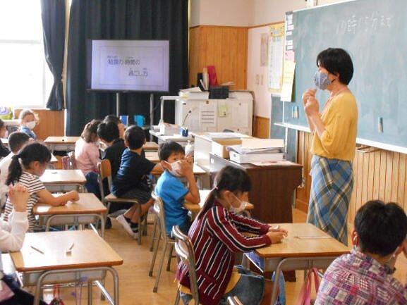 各クラスとも、映像資料を使って事前に新しい給食の方法を確認しています。