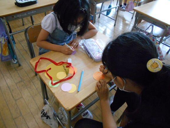 みんなで1年生に贈るプレゼント(メダル)を作りました。2年生以上のみんなが、心をこめて書いたメッセージをメダルに貼り完成です。