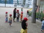 6年生に手を引かれ、1年生が各集合場所まで向かいます。