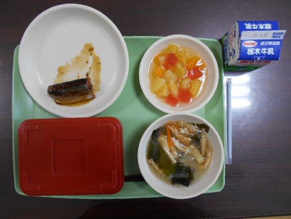 ごはん・牛乳のほか、さんまのかぼすレモン煮・じゃがいもと玉ねぎのみそ汁、そしてフルーツポンチが付きました。