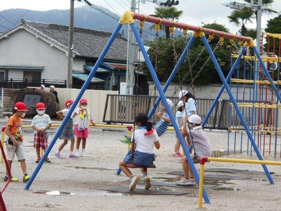 運良く、昼休みには雨が上がりました。子どもたちは元気いっぱい、校庭に飛び出します。
