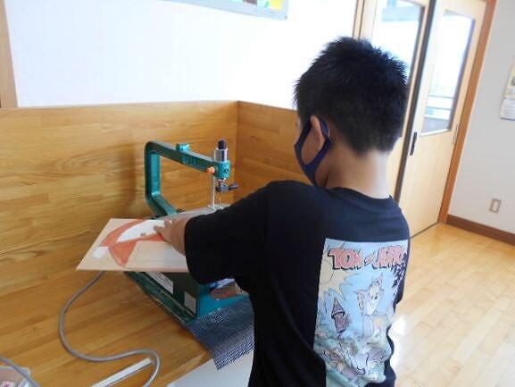5年生の図工で、伝言板づくりをしています。薄い板を好きな形に切って作りますが、初めて使う電動糸のこに苦戦しているようですよ。