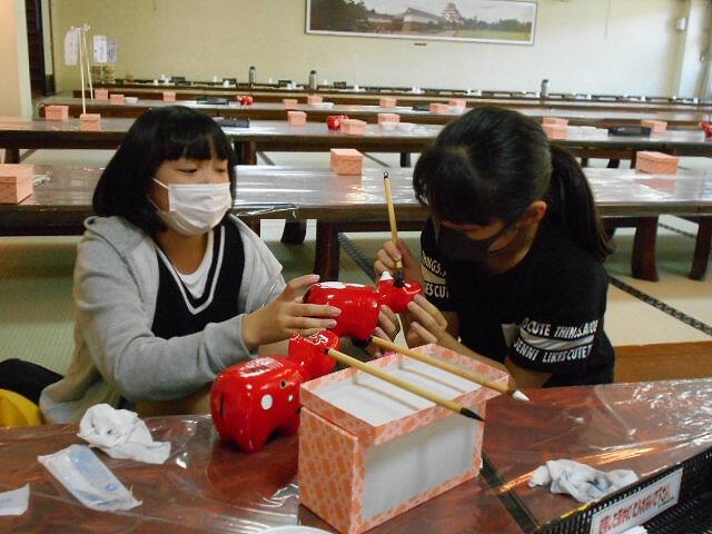 まずは、赤べこの絵付け体験です。みんな真剣に赤べこと向き合っています。
