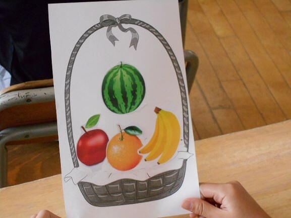 いくつもある果物の中から好きなものを4種類選んで、バスケットの中に入れて、フルールバスケットを作りました。友達は何を選んだのかな?気になりますね!